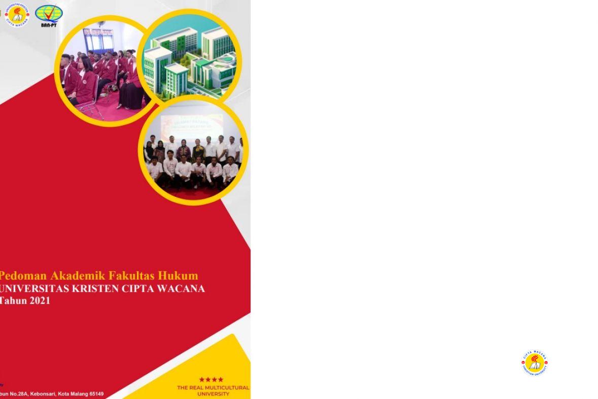 Buku Panduan Fakultas Hukum Tahun 2021 ini disusun atas dasar tuntutan perkembangan pendidikan baik di tingkat nasional maupun internasional serta untuk mewujudkan visi dan misi Fakultas Hukum Universitas Kristen Cipta Wacana. Visi Program Studi S-1 Ilmu Hukum yaitu: “Menjadi Fakultas Hukum Unggul dan Kompetitif di bidang Hukum Tata Negara (HTN) berbasis keadilan pada Sistem Hukum Nasional dan Internasional untuk kesejahteraan umat”. Adapun misi yaitu: Melaksanakan Pendidikan dan Pengajaran yang Unggul dalam Ilmu Hukum Tata Negara (HTN) berbasis keadilan pada Sistem Hukum Nasional dan Internasional untuk kesejahteraan umat; Melaksanakan Penelitian yang Unggul dalam Ilmu Hukum Tata Negara (HTN) berbasis keadilan pada Sistem Hukum Nasional dan Internasional untuk kesejahteraan umat; Melaksanakan Pengabdian dalam lingkup Hukum Tata Negara (HTN) berbasis keadilan pada Sistem Hukum Nasional dan Internasional untuk kesejahteraan umat; Membangun kerjasama dengan berbagai pihak di dalam dan luar negeri dalam rangka melaksanakan tridharma Perguruan tinggi dan penguatan jaringan kerja.